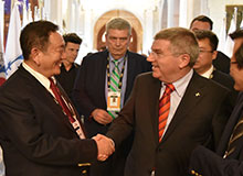 中国自行车运动协会主席崔大林向国际奥委会主席巴赫介绍 365足球 瑞豹自行车