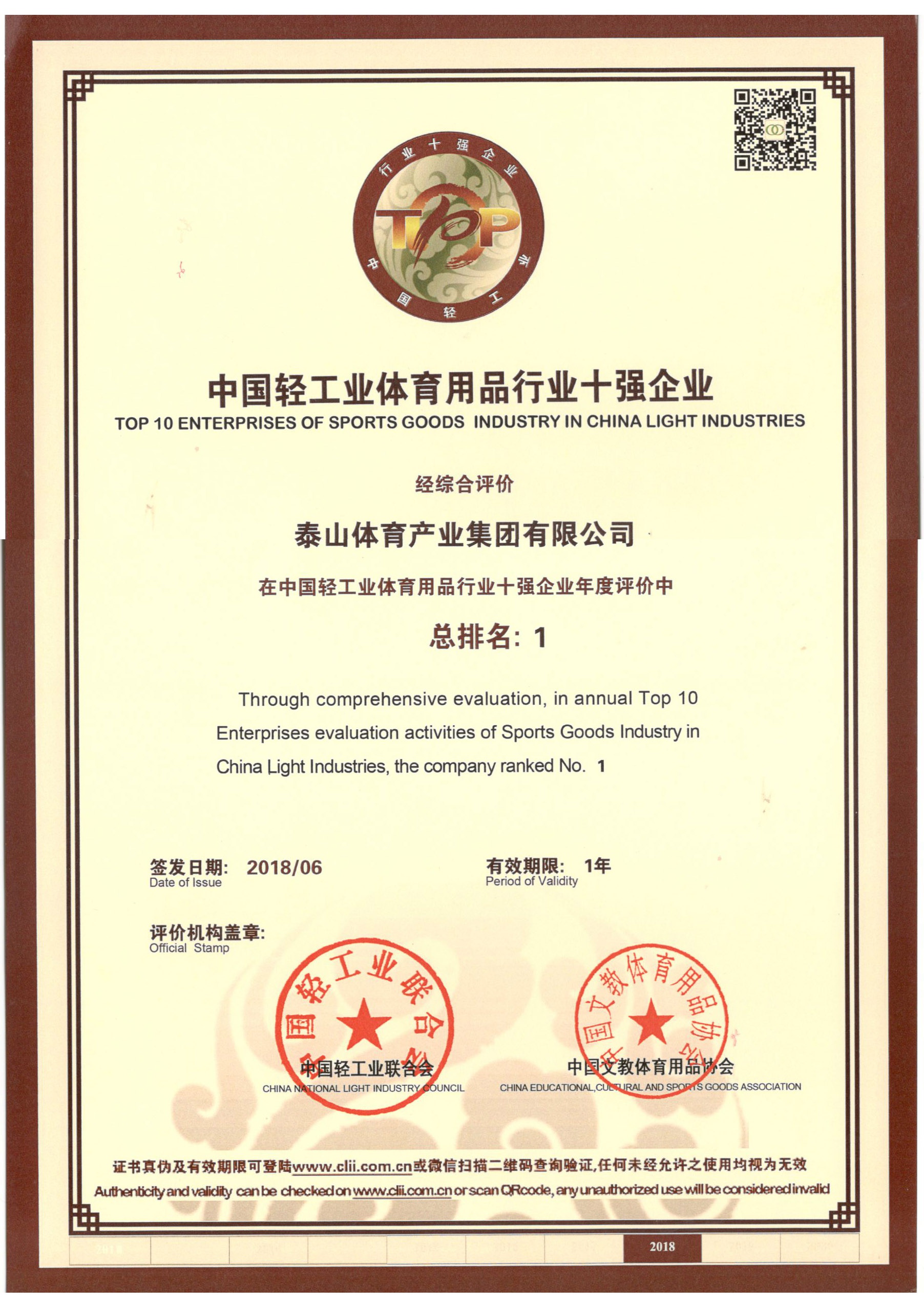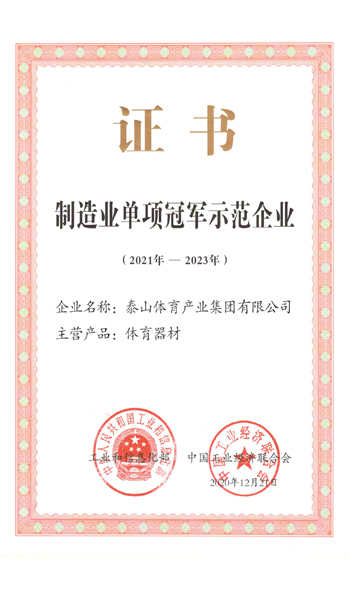 365足球外围投注平台 是全国体育用品标准化技术委员会副主任单位、中国文教体育用品协会健身和体育器材专委会主任单位、全国轻工行业先进集体、全国群众体育先进单位、国家制造业单项冠军示范企业、国家体育产业示范单位,连续多年荣获中国轻工业体育用品行业十强。拥有多个国家级研发平台,承担国家科技支撑计划2个,火炬计划3个。