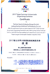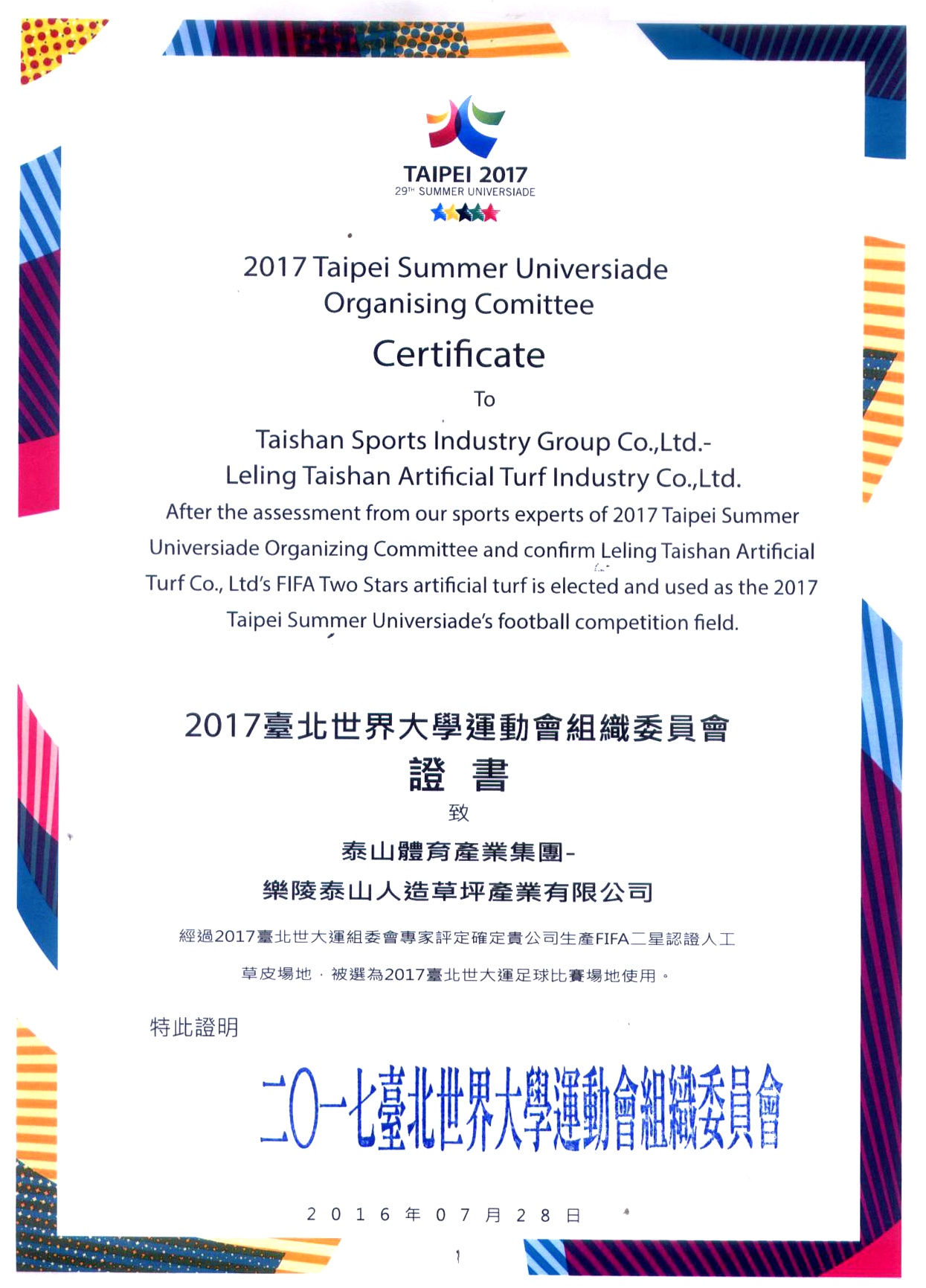 2017台北世界大学运动会组织委员会证书致乐陵365足球 人造草坪产业有限公司